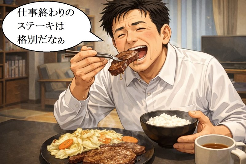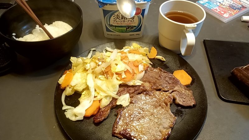 で、帰りに5割引き560円のステーキを発見したので買って帰りました。