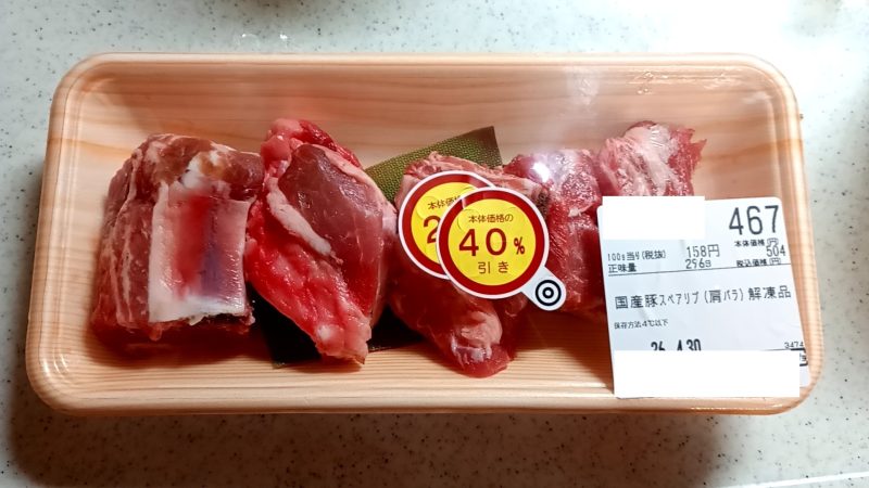 4割引きのスペアリブ、300円ぐらいを買いました。
